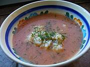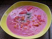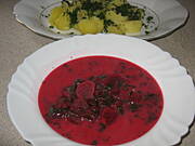 Barszcz czerwony z ziemniakami kraszonymi boczkiem z cebulką i koperkiem wg.niebieskiej-różyczki