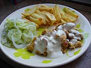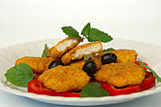 Polędwiczki z kurczaka (zamarynowane, a później usmażone w bułce tartej), kluski kładzione i pieczarki na gęsto.