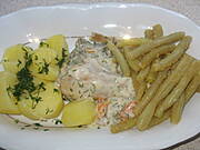 Smażony dorsz z ziemniaczkami i surówką do tego