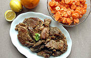 Mieso schabowe duszone z cubula i pieczarkami podane z kasza perlowa i surowka z bialej kapusty i szczypiorku.