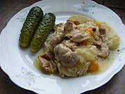 Kasza jęczmienna z warzywami, gulasz drobiowy i kiszony ogórek.