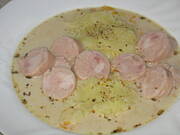 surowa biala kielbasa duszona w bialym winie i mix salat w winegrecie musztardowym