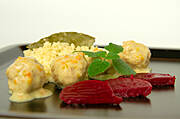 U nas dzisiaj makaron z pulpetami cielęcymi oraz plastrami słodko-kwaśnych buraczków.