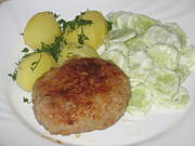 Kotlety mielone z natką i czosnkiem, ziemniaki z koperkiem, ogórki małosolne, buraczki wiórki (własnego wyrobu), sałata z ogórkiem, pomidorem, rzodkiewką z dressingiem z miodu, musztardy i octu balasamicznego.