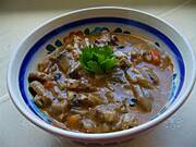 sosik wieprzowo-pieczarkowy i kasza do wyboru" gryczana lub jęczmienna. Do tego surówka z młodych warzyw z sosem jogurtowo-majonezowym