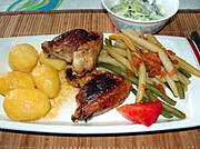 Pieczone udka, ziemniaki, kapusta z koperkiem i boczkiem.