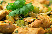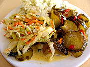 Langosze , duszone udka z kurczaka i ogórki curry.