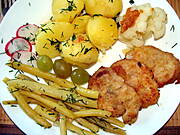 Kotleciki z polędwiczki wieprzowej, ziemniaki, kalafior. fasolka szparagowa zasmażana z czosnkiem, sałata ze śmietaną...wszystko posypane koperkiem.