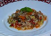 Środa: makaron penne z sosem mięsno warzywnym.