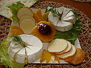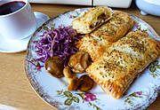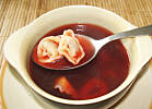 Kompot agrestowy z makaronem, pieczarki z serem mozzarella w cieście francuskim, czysty czerwony barszczyk do popicia.