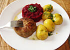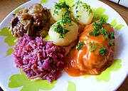 Kluski śląskie z gulaszem wołowym i buraczkami z cebulką