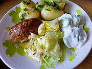 Niedziela, więc trzeba pójść na łatwiznę :) Młode kartofelki chyba baaardzo wodniste, bo raczej się ugotowały :) Mięsko - miodzio :) Do tego pekinka z sosem greckim + kalafior prosto z wody + sos czosnkowy :)