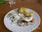 Smażony szczupak z ziemniakami z koperkiem i surówką z białej kapusty