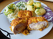 Chrupiący kotlet z szynką i serkiem topionym, ziemniaczki z koprem,. sałata lodowa i mizeria z szczypiorkiem i śmietaną.