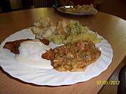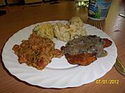 Niedziela duszona kapustka, ziemniaczki, filety z udźca kurczaka opieczone w płatkach kukurydzianych i pieczarki w cieście (mniam).... kapusta i mięsko zostało więc jeszcze dziś się podelektujemy