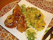 Piątek: ziemniaki z koperkiem, kotlety z tuńczyka w płatkach owsianych, sałata z oliwkami, pomidorem itd, z vinegretem.
