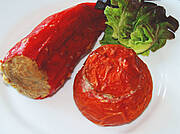 wczoraj losos z patelni ziemniaki z koperkiem i salata z vinegretem,dzisiaj papryka faszerowana miesem,ryzem i pieczarkami zapiekana z beszamelem i parmezanem salata i bagietka z maslem czosnkowym