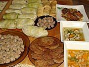 Makaron z kompotem wiśniowym, ryż z warzywami, kurczak z pieczarkami, ogórki małosolne i sałatka z pomidorów z cebulą. Do picia tradycyjnie schłodzona herbata z cytryną.