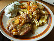 Bitki z karkówki z marchewką, makaron i mizeria, do picia kompot z jabłek i schłodzona herbata z cytryną.