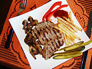 Rosół z makaronem, marynowane polędwiczki wieprzowe z rusztu, frytki, pieczarki duszone na maśle, ogórek małosolny.