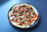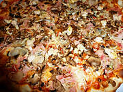 Dzisiaj późna obiadokolacja, reszta wczorajszej fasolki i pizza z kawałkami wieprzowiny, cebulą , serem, pieczarkami i szynką.