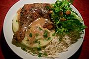 Udka z patelni, ryż i sałata lodowa z sosem czosnkowym i szczypiorkiem. Do picia kompot jabłkowy i woda z sokiem malinowym.