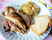 Dzisiaj obiad na życzenie męża:) Golonka gotowana w ziołach, kapusta kiszona gotowana z jabłkami, majerankiem i kminkiem, pieczywo.