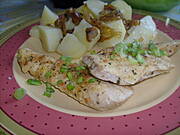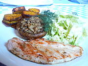 Grillowane pieczarki z masłem czosnkowym + filet z kurczaka z grilla .....ziemniaki pieczone + kapusta pekińska ze świeżym ogórkiem w sosie miodowo-musztardowo-czosnkowym ....