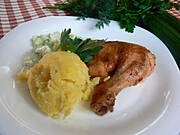 Udko z kurczaka z sosem pieczeniowym, puree ziemniaczane ze szczypiorkiem, mieszanka sałat z winegretem i pestkami dyni, surówka.