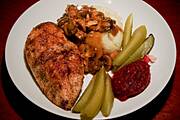 Smażony filet z kurczaka, tłuczone ziemniaki, sos pieczarkowy, posypka z prażonej cebulki, ogórki kiszone, ćwikła z chrzanem.