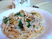 Makaron z młodym bobem, pomidorkami koktailowymi (na oliwie z czosnkiem) z piersią indyka i orzechami piniowymi.