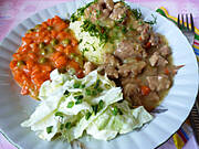 Ziemniaki z koperkiem, gulasz z karkówki, marchewka z groszkiem, sałata lodowa z sosem czosnkowym i szczypiorkiem.