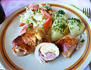 Roladki drobiowe z pieczarkami, kotlety drobiowe panierowane, gotowane ziemniaki, grillowana cukinia, mieszanka sałat z sosem czosnkowym, surówka, sos z sera pleśniowego.