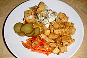 Filety z kurczaka w sosie pieczeniowym, pieczone ziemniaki z suszonymi pomidorami i serem pleśniowym, kiszone ogórki, sałatka warzywna w zalewie octowej, smażone pieczarki.