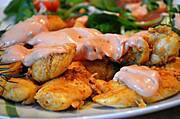 Paluchy z fileta kurczaka panierowane,sos czosnkowy,frytki,mizeria.