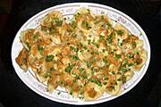 Zapiekanka z ziemniaków, cebuli, piersi kurzęcej z oregano i peperoncino, pomidory z oliwą, octem i bazylią.