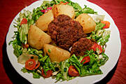 Kotlety mielone, gotowane ziemniaki, mieszanka sałat z cytrynowym winegretem, pomidorkami cherry, szczypiorkiem i pestkami dyni.