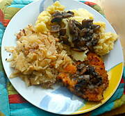 Kotlet schabowy lub roladki drobiowe z kaszą gryczaną,warzywami i pieczarkami,do tego sos grzybowy,ziemniaki surówka meksykańska.