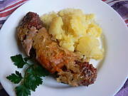 Kaszanka zawinięta z boczkiem ,cebulą i własną kapustą kiszoną upieczona w piekarniku + ziemniaki piure...