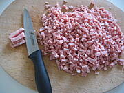 - 4 ziemniaki, 4 ogórki kiszone, 4 jajka, 1 duża marchew, 1 mały groszek, 1 mały por ( cały ) - i teraz powinna być gotowana pierś z kurczaka ewent. inne chude rosołowe - a ponieważ przy Wielkim piątku rosołu nie było, więc wkroiłam 30 dkg. tej szynki. Jest bardzo dobra - soczysta i ładnie pachnie.
