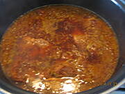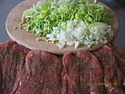 Mięso na dużej patelni obsmażyłam na mocno rumiano - krótko, ale duży gaz. Dno brytfanny posmarowałam cieńko pastą sambal oelek ( uwaga - ogień ! ) i ułożyłam opieczone plastry.