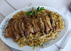 Goplano, ja takie mięsa /bez sosu, bo to w sumie jest "mokre", ale nie jest w sosie/ podaję z ziemniakami... pogniecione, z dodatkiem odrobiny gorącego mleka i ciutki masła, które układam na drugim półmisku i potrzepuję np. koperkiem lub tylko nim ozdabiam, w zależności co mam. A surówka, hm, nie pamiętam jaka była, ale z pewnością ćwikła z chrzanem i chyba surówka z pekinki z brzoskwiniami /na Wielkanoc z reguły serwuję ćwikłę i surówkę porową, ale tu już por był/...