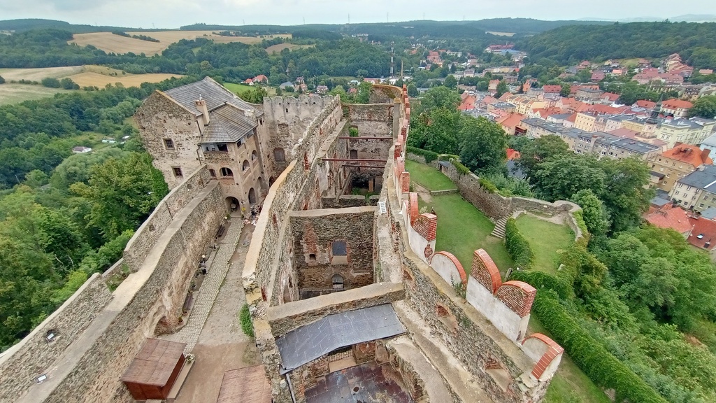 Wczoraj pojechaliśmy do Bolkowa. Ale super mieścina - cisza, mało ludzi, wszystko zadbane, stare domki, kamienica z podcieniami i ogólna życzliwość. Mieliśmy wrażenie, że jesteśmy jedynymi turystami. Połówek zgłodniał i poszliśmy do baru na kartacze. Jadł ze smakiem. Ja nie byłam głodna więc odpuściłam. Potem pomaszerowaliśmy zwiedzać zamek. Akurat tego dnia trafiło nam się darmowe wejście. Ku naszemu zaskoczeniu prawie nikogo nie było. Może aura wystraszyła turystów ...? Miejsce naprawdę bardzo ciekawie warte odwiedzenia. Widoki z góry fantastyczne a ruiny zamku doskonale zachowane, bez przesadnych odnowień.
