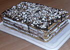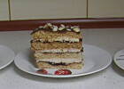 , bo nie stety nie mam tak dużych blaszek , jak podano w przepisie. Do kremu dodałam adwokat , bo to jedyna "wódka " jaką mam w domu. Wierzch polałam roztopioną czekoladą i posypałam siekanymi migdałami. Mam tyko jedem problem - ciasto wygląda bardzo apetycznie i nie wiem czy za kila dni co kolwiek z niego zostanie ( a ponoś kilkudniowe jest najsmaczniejsz)