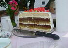 Zrobiłam ciacho w formie tortu. Do masy dodałam więcej żelatyny i galaretkę cytrynową (bałam się że masa mi się nie zetnie ze względu na upał). Wyszło bardzo dobre, choć smak gruszek nie był zbyt mocno wyczuwalny.