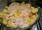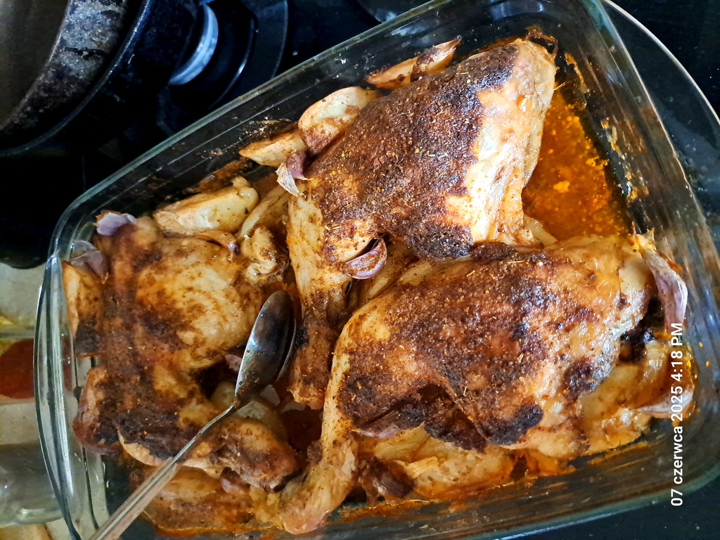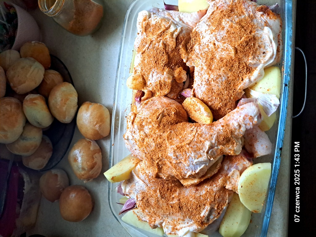 Robię podobnie, tylko ziemniaki kroję w plastry, wtedy jest się pewnym,że nie będą surowe, a kurczaka doprawionego(na noc)obs