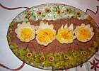 Uformować w rękach. Posmarować ręce oliwą, obtoczyć jeszcze raz befsztyk. Ułożyć mięso na półmisku. Dekorować . Lilia, do środka żółtko.