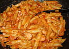 W tym czasie ugotować makaron w osolonej wodzie (ja wsypuje go tak na oko), odcedzić i dodać do sosu. Podsmażyć na większym ogniu by makaron i sos się połączył.