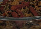 Na tłuszczu pozostałym ze smażenia kiełbasy (można ewentualnie uzupełnić łyżką masła) podsmażamy pokrojoną