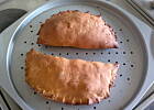 Po tym czasie podzielić na 4 części. Każdą z nich rozwałkować na koło o średnicy 20 cm. Połowę posmarować koncentratem pomidorowym ,nałożyć farsz, zostawiając około 1 cm wolnego od brzegu. Posypać startym serem. Brzegi ciasta posmarować wodą, zgiąć w połowie. Brzegi dobrze skleić.